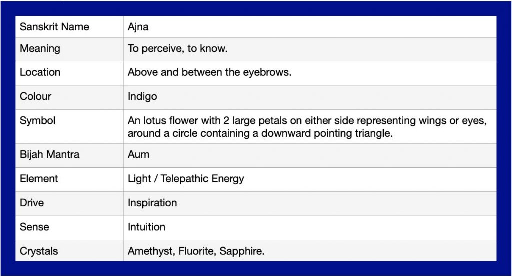 Ajna chakra is the 6th energy centre and is located between the eyes, slightly above the bridge of the nose. It is associated with the pituitary gland which is often considered to be the master controller of the endocrine system. Ajna chakra is associated with our ability of discernment - there are no excuses where this chakra is concerned. When something is right, we just ‘know it’, and we are therefore able to lead an inspired life. When we are born, it is thought the third eye is very much open, but this sixth sense of wisdom, intuitiveness and insight can make life very uncomfortable and so we may train ourselves to shut this facility down. Those with an open or balanced third-eye chakra are alert to coincidences and often experience moments of pure insight, perception or clairvoyance.
